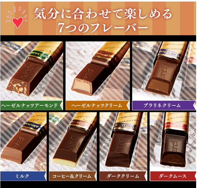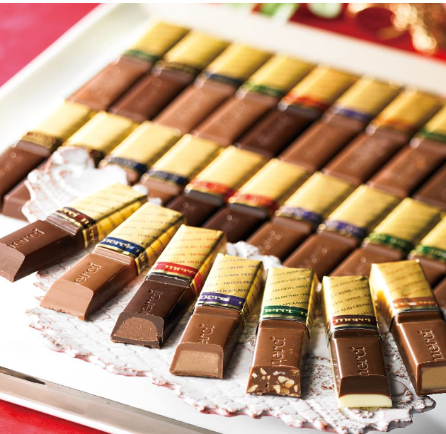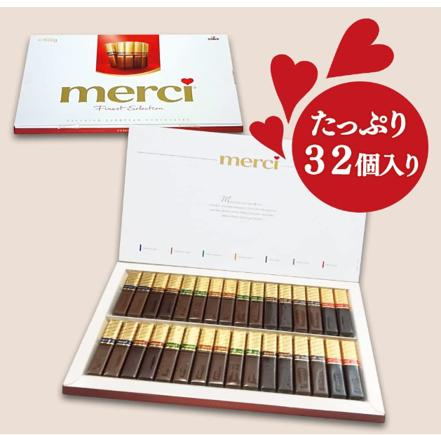 箱をあけてみると、整然と並ぶチョコレートに思わずうっとり。 7つのフレーバーを楽しめます。 内容量/400g(32個) 1箱サイズ/19.5×34×1.8(高さ)cm