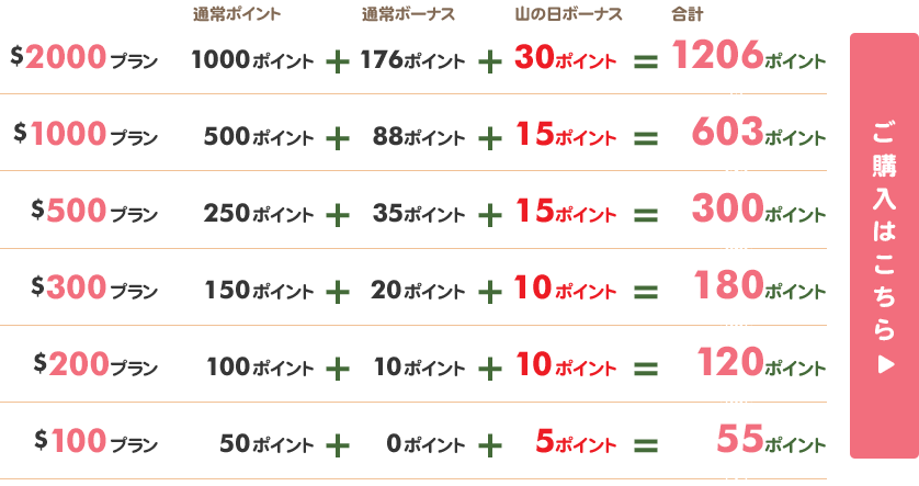 ※$100以上のプランをご購入いただいた方に特別ボーナスが加算され、$100未満のプランをご購入いただいた場合は対象外となります。